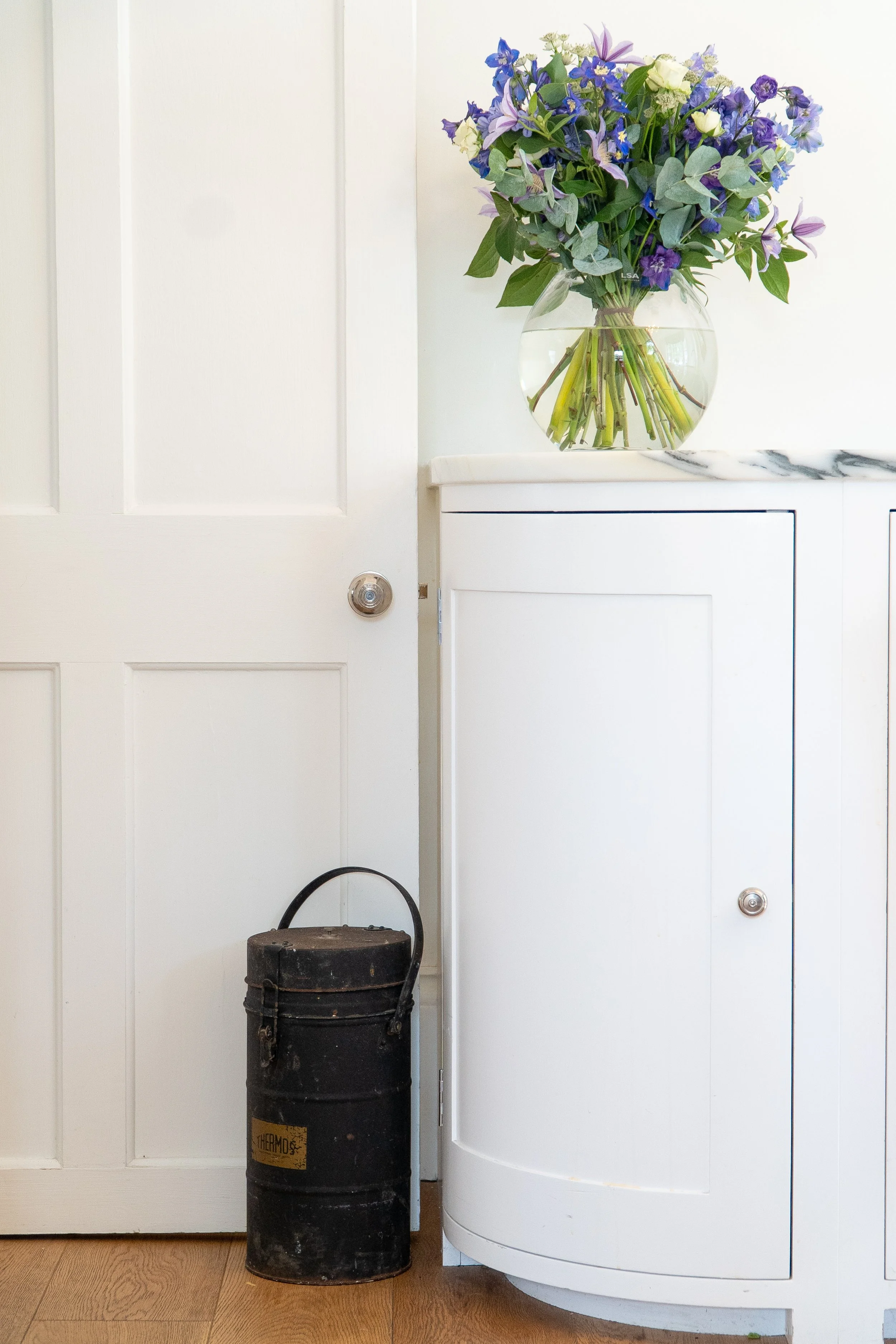 A black metal thermos with a handle stands on the floor beside a white cabinet, with a clear glass vase filled with purple and white flowers on top of the cabinet.