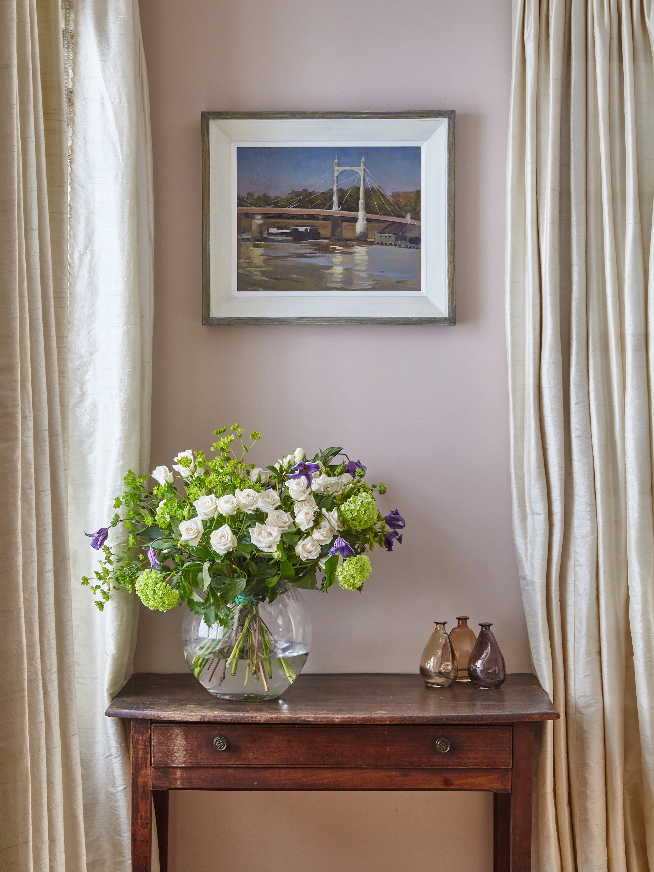 A wooden table with a large bouquet of white roses, purple lisianthus, and green hydrangeas in a round glass vase, with three small decorative glass bottles, against cream-colored curtains and a framed painting of a bridge over water.